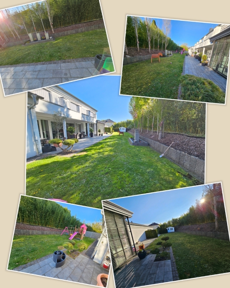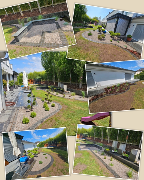 Wegen des abfallenden Gartens musste ein entsprechender Unterbau mit Frostschutzschotter erstellt werden. Anschließend wurden Tiefbordsteine betoniert um eine Begrenzung zum Rasen zu herzustellen.